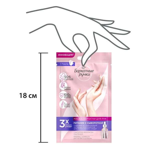 Пока маска-перчатки надеты (15-40 минут), кожа впитывает питательную сыворотку. Эффективность перчаток по сравнению с кремом усиливается тем, что внешний слой перчаток создаёт парниковый эффект, согревает и расслабляет кожу, усиливая эффективность сыворотки.