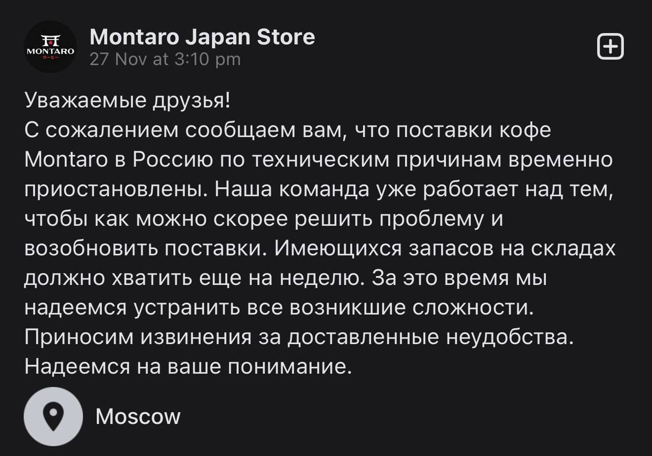 Поставщик японского кофе «Montaro» в Россию в социальных сетях сообщил о приостановке поставок напитка в нашу страну. Заморозку поставок компания-поставщик объясняет «техническими причинами».