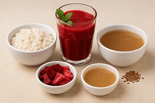 Состав (пример): свекольный сок, сок квашеной капусты, настой мяты, ложка льняного масла. Употребляется натощак в тёплом виде.