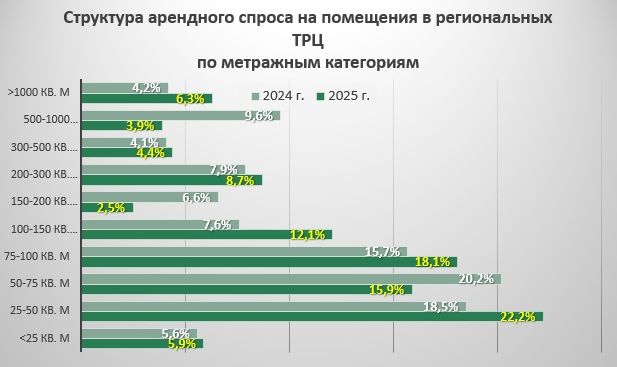 Существенный приток арендаторов зарегистрирован в категориях «100-150» (плюс 4,5 п.п. до 12,1%), «75-100» (плюс 2,4 п.п. до 18,1%) и «25-50» (плюс 3,7 п.п до 22,2%). Самыми слабыми местами регионального ритейла оказались лоты размером от 500 до 1000 кв. м, от 150 до 200 кв. м и от 75 до 100 кв. м. Совокупный вклад этих трех групп в общем объеме сделок снизился с 36,4% до 22,3%, то есть на треть. Доли помещений площадью 300-500 кв. м, 200-300 кв. м и до 25 кв. м остались приблизительно в тех же рамках, что в 2024 г.