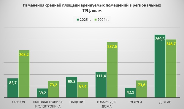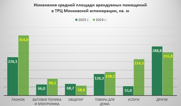 По четырем остальным категориям прослеживается четкий тренд на сокращение площадей. Так, в московских и подмосковных ТРЦ вчетверо уменьшился метраж сервисных объектов (с 214,3 до 55,0 кв. м). Новые магазины, которые специализируются на fashion-товарах и БТиЭ, в полтора раза уступают по габаритам тем, которые открылись годом ранее. К декабрю 2025 г. их средние размеры ограничиваются 226,1 кв. м и 66,0 кв. м соответственно. Продавцам бытовых товаров требуется несколько меньше пространства, чем в прошлом году – в среднем 126,3 кв. м вместо 138,2 кв. м (минус 8,6%).