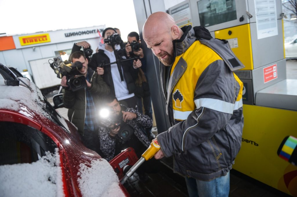 «Роснефть» и знаменитый боец смешанных единоборств Джефф Монсон по прозвищу «Снеговик» на одной из московских АЗС нефтяной компании поздравил автолюбителей с наступающим Новым Годом и подарил полезные зимние подарки для автомобиля.
